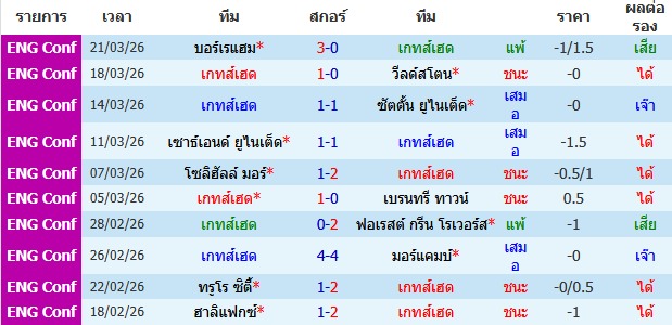 ผลงาน 10 นัดหลังสุดของทีม เกทส์เฮด
