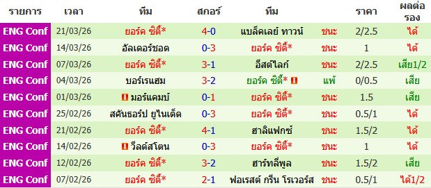 ผลงาน 10 นัดหลังสุดของทีม ยอร์ค ซิตี้