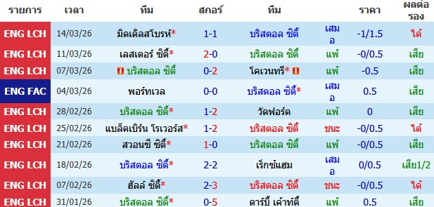 ผลงาน 10 นัดหลังสุดของทีม บริสตอล ซิตี้