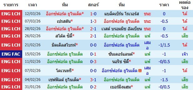 ผลงาน 10 นัดหลังสุดของทีม อ็อกซ์ฟอร์ด ยูไนเต็ด