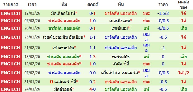 ผลงาน 10 นัดหลังสุดของทีม ชาร์ลตัน แอธเลติก