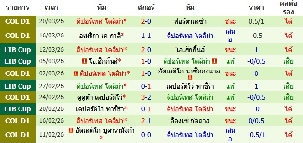 ผลงาน 10 นัดหลังสุดของทีม ดิปอร์เตส โตลิม่า